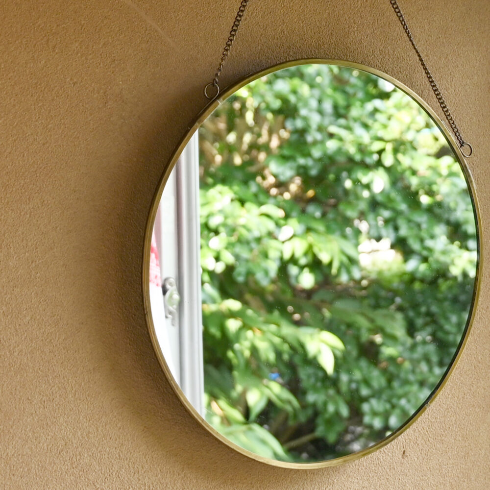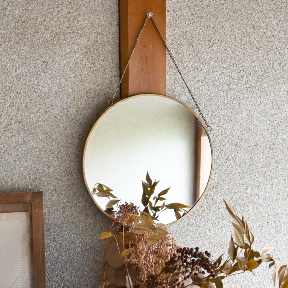 真鍮で縁取りされた大きな丸いミラーは、どんなテイストのお部屋にも馴染む一品。
