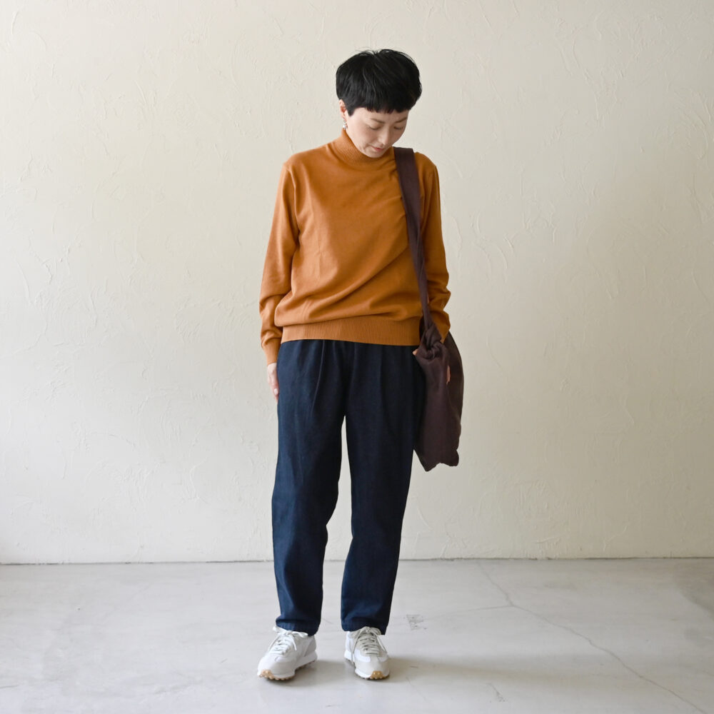 主役のトップスを上品に引き立てるのもこのテーパードデニムの得意技。