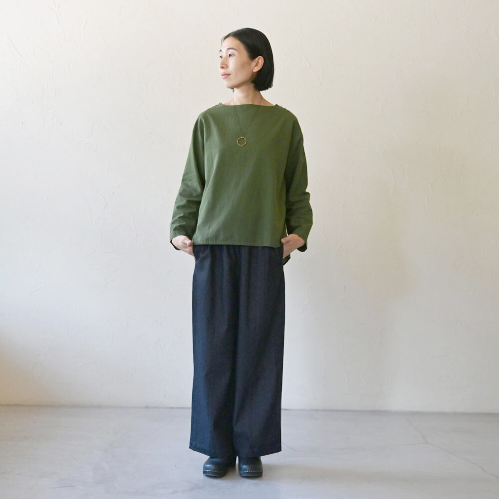 首元がゆるく横に空いたボートネックのグリーントップスとシンプルに合わせました。