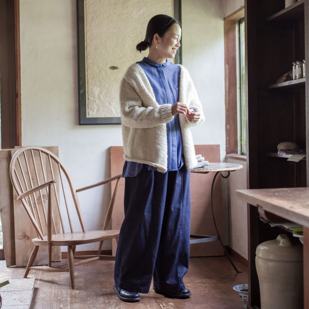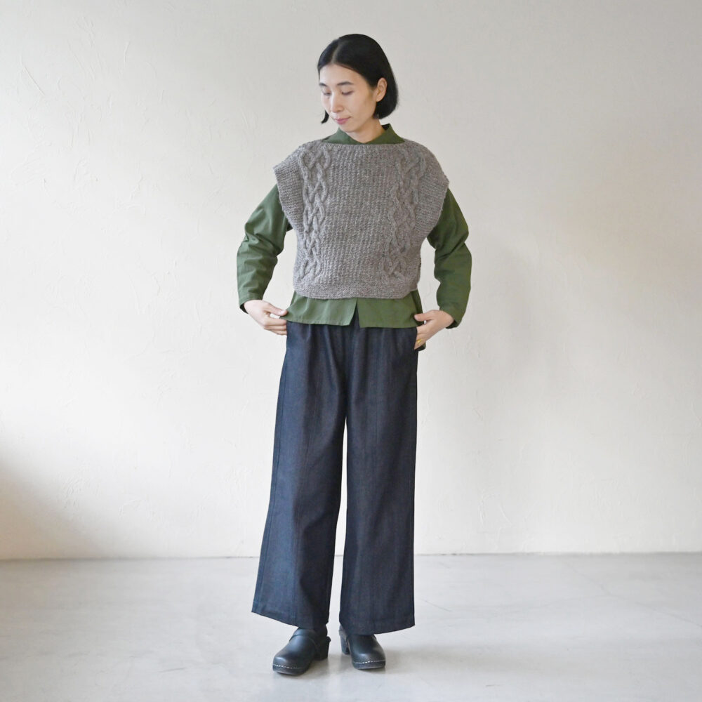 ショート丈の手編みニットとの組み合わせもお楽しみいただけます。
