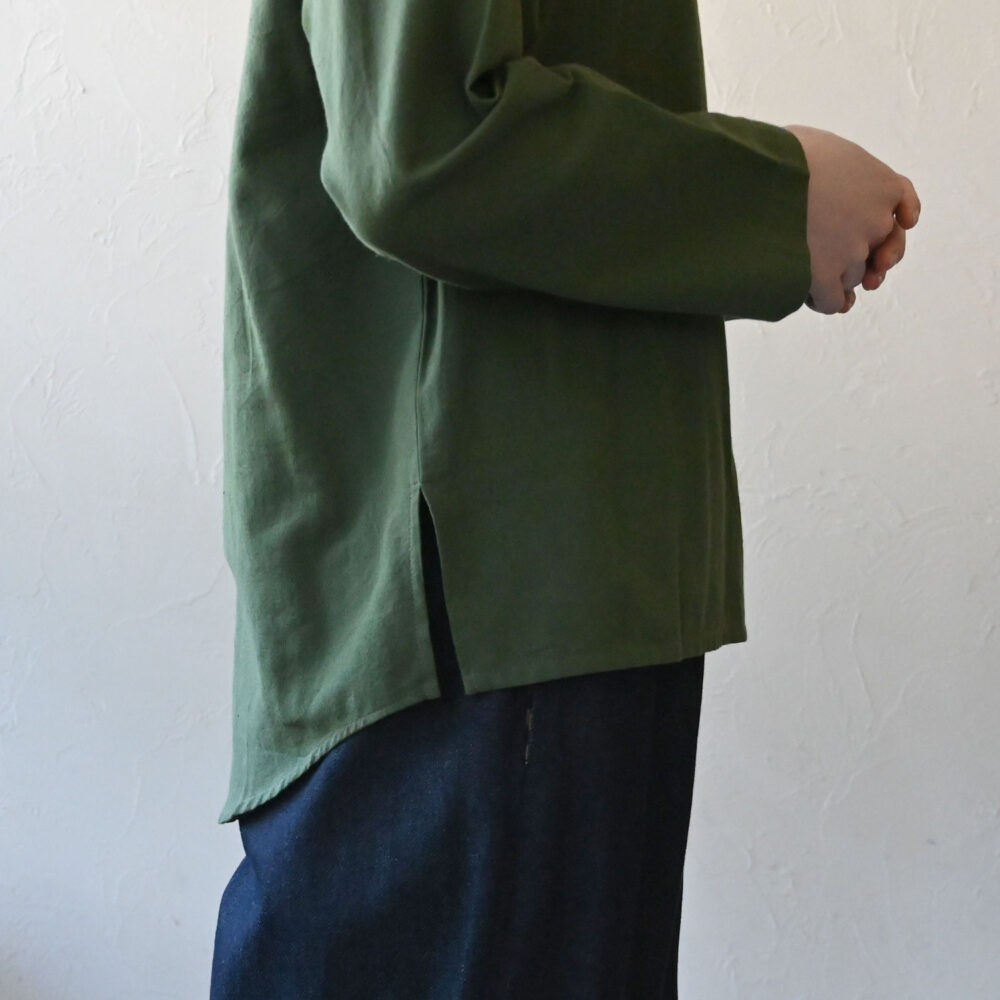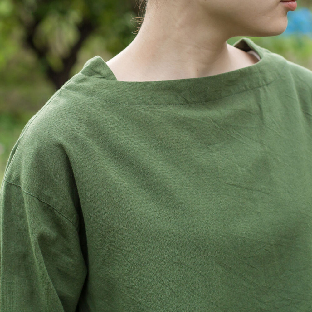 ネックラインに太めに走るステッチと、首元にさり気なく足してあるマチがポイント。