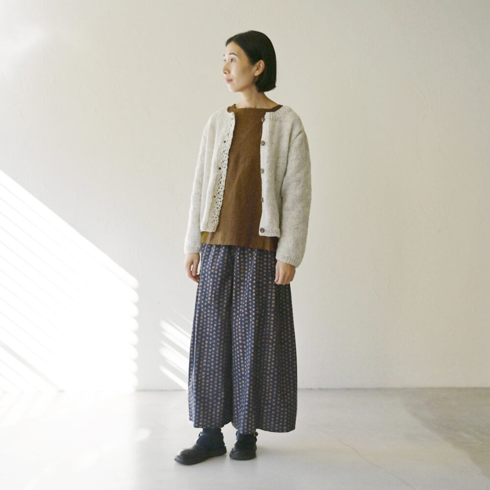 腕回りがスッキリな分、カーディガンやジレの重ね着など、長く幅広く使えます。