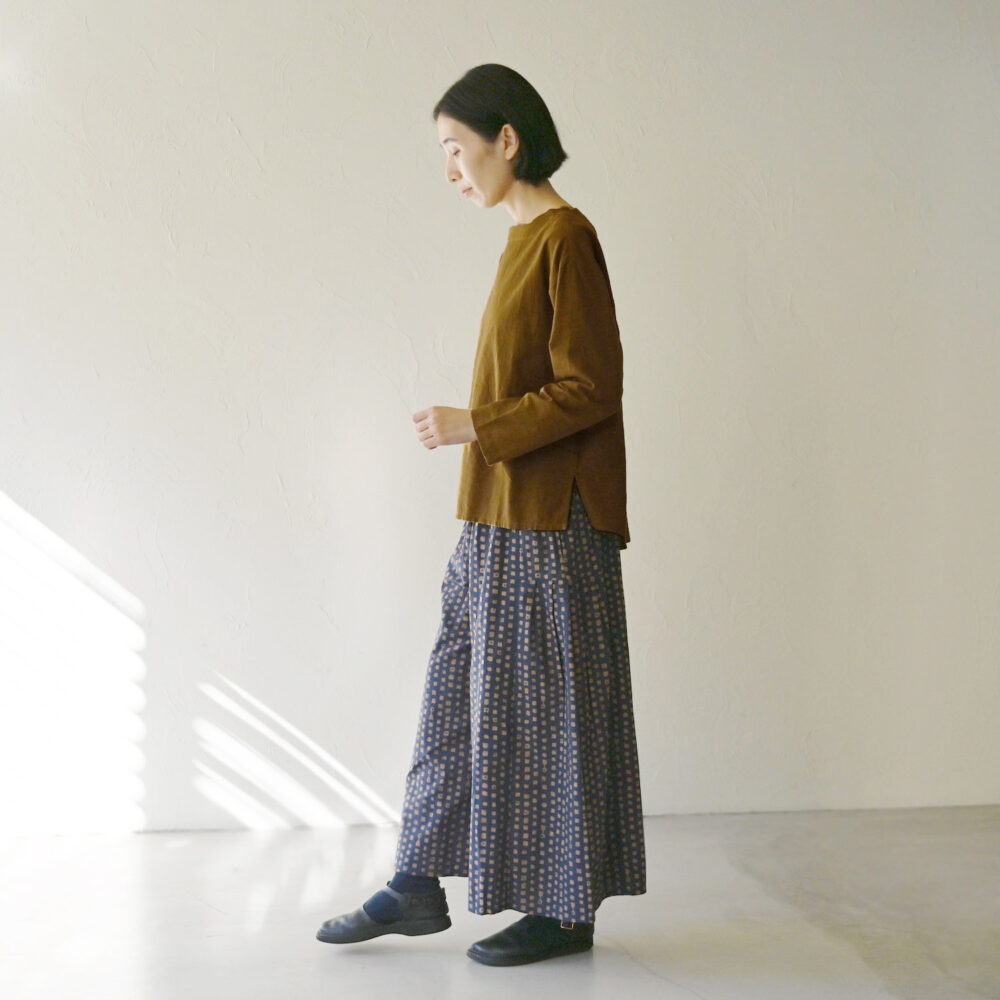 ロングTシャツ感覚とはいえ首元が空きすぎず落ち着いた印象のトップスに仕上がっています。
