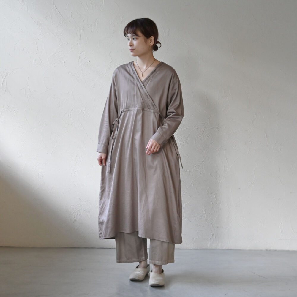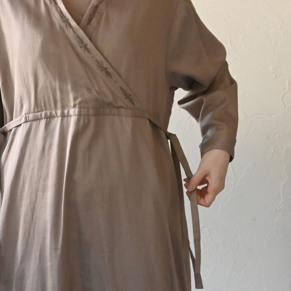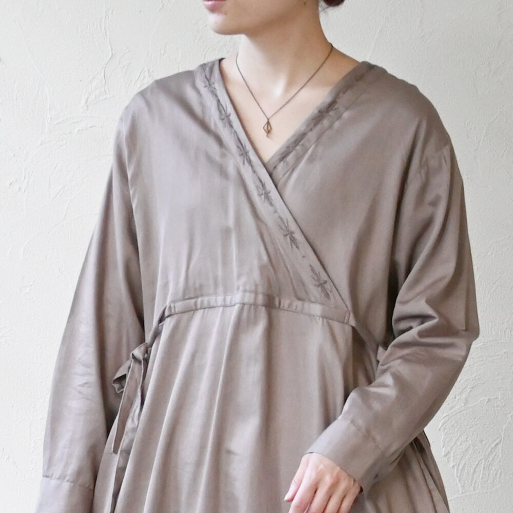 やわらかい光沢が人気のサテンコットン生地で、カシュクール風のワンピースをお作りしました。