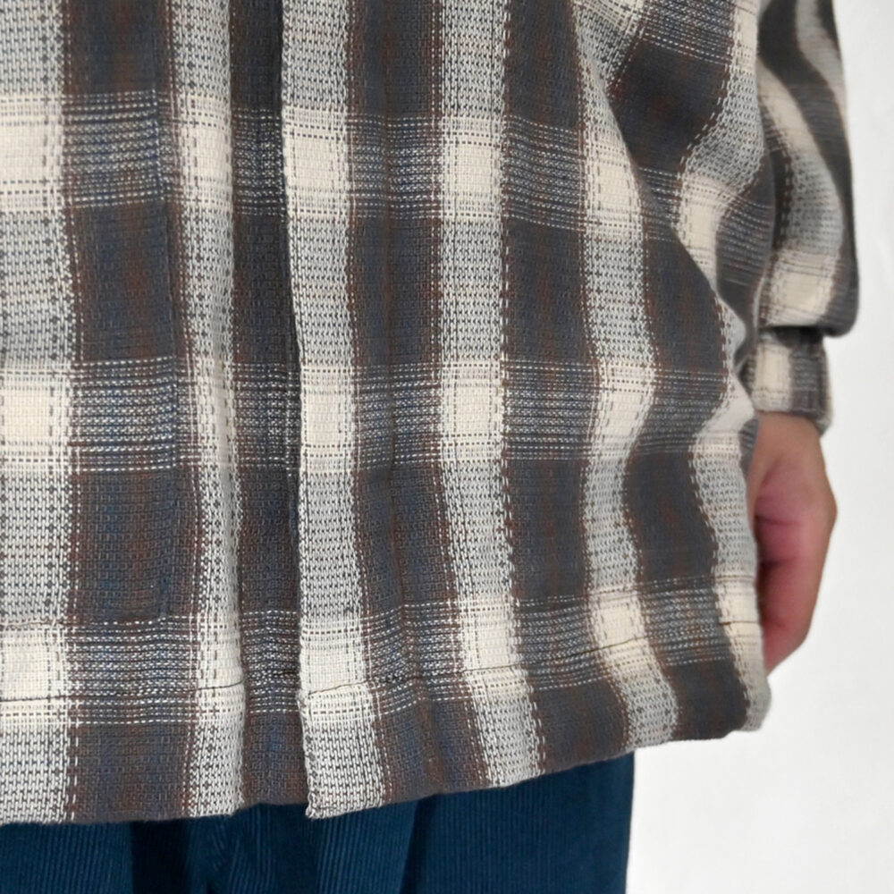 今回の生地は、コレクションテーマである「光」に合わせて4色の糸でグラデーションにチェックを織り上げ、絶妙な光の濃淡を表現しました。