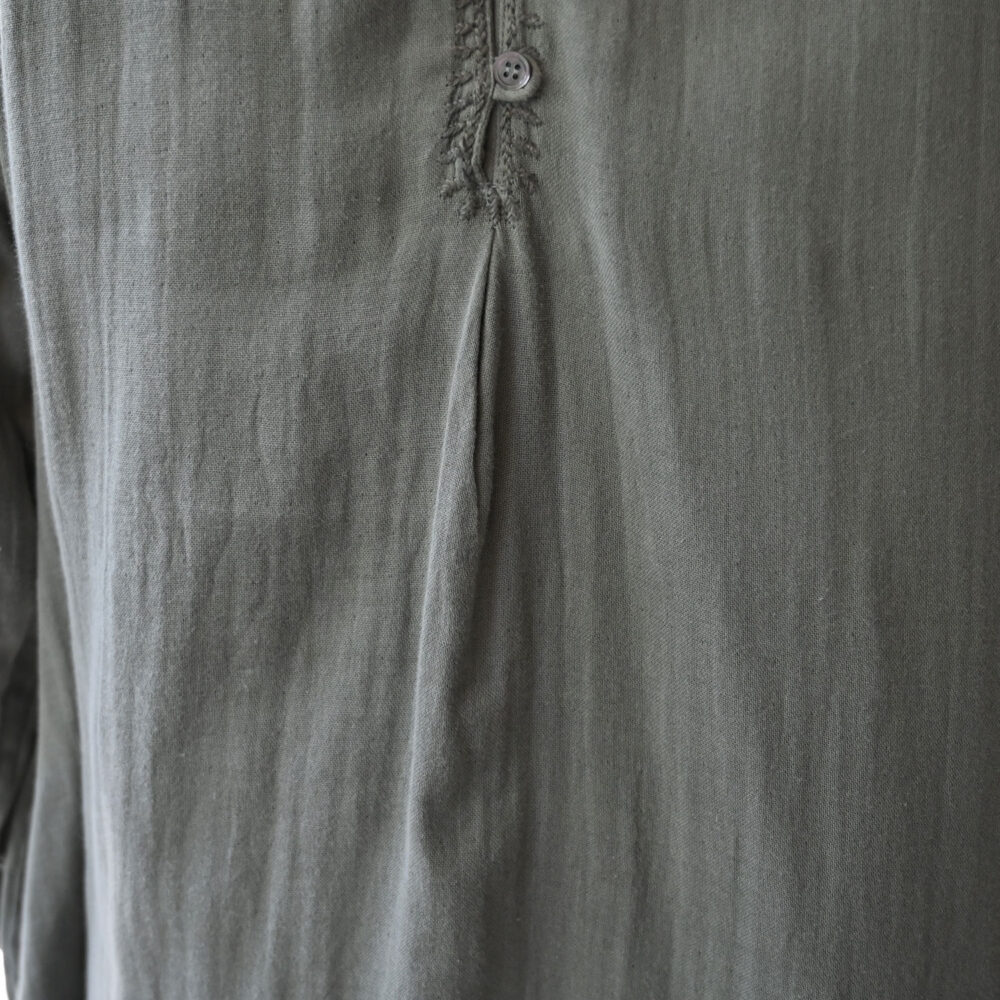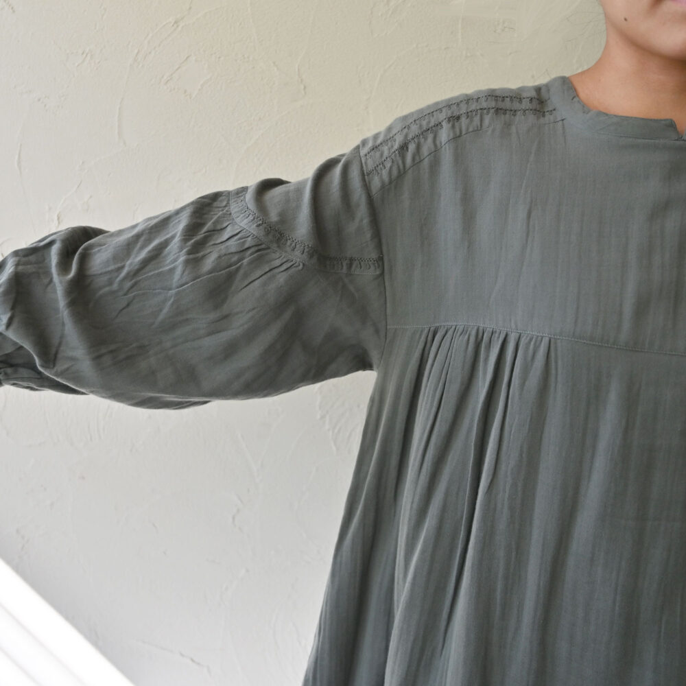 ボタン下やヨーク下に入ったタックが、このワンピースのシルエットに動きをプラスしています。