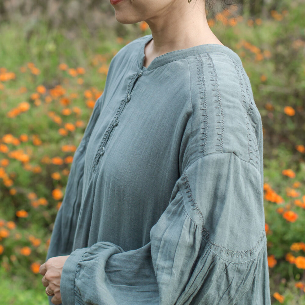 丸いヨークの入った袖のデザインや、あちこちに装飾された手刺繍は、コレクションテーマである「光」をイメージしたもの。