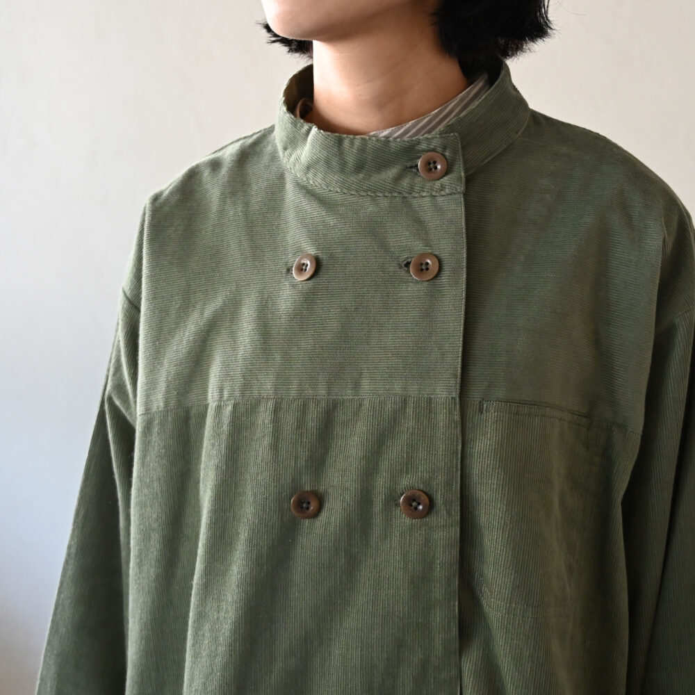 太幅のスタンドカラーとダブルボタンが、コートのイメージを可愛らしく演出します。