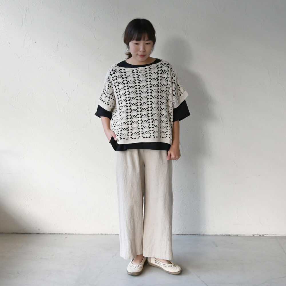 トップスに透かし模様のサマーニットを重ねたレイヤードスタイル。