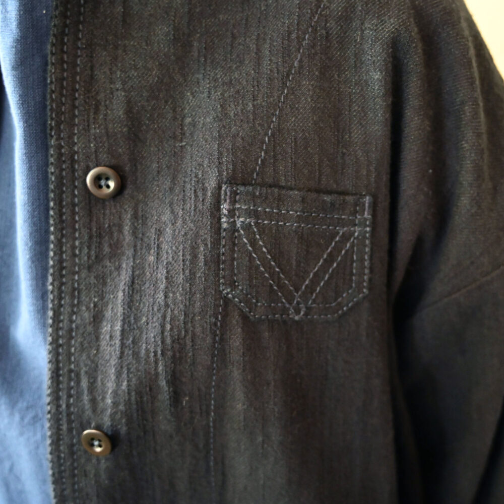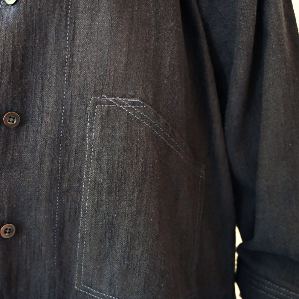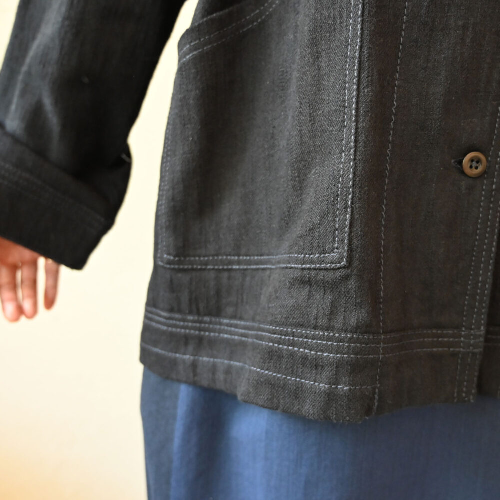 裾部分と前開き部分にぐるりと縁どられた三本ステッチは、存在感のあるデザインのひとつ。