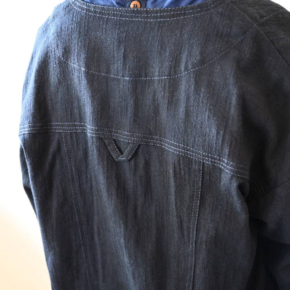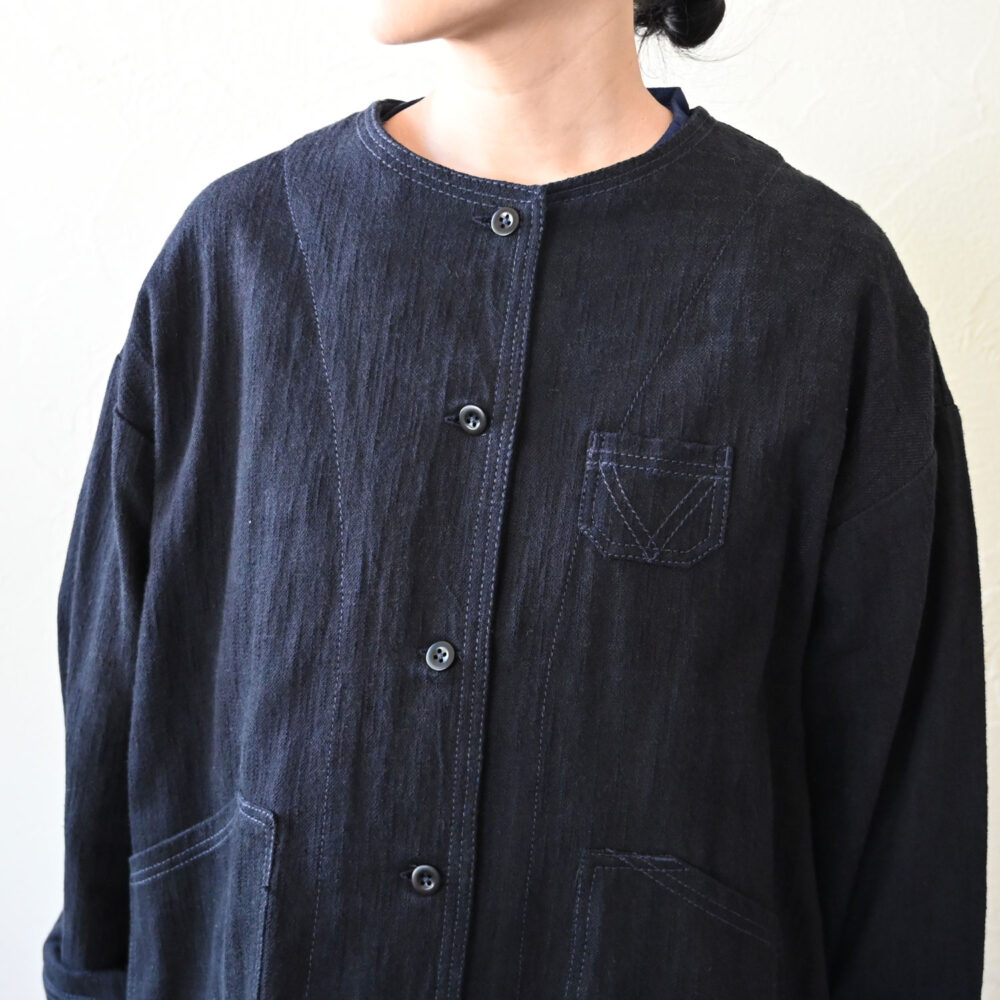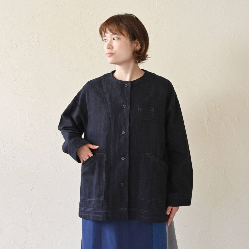 あちこちにデザインポイントが散りばめられたノーカラージャケット。