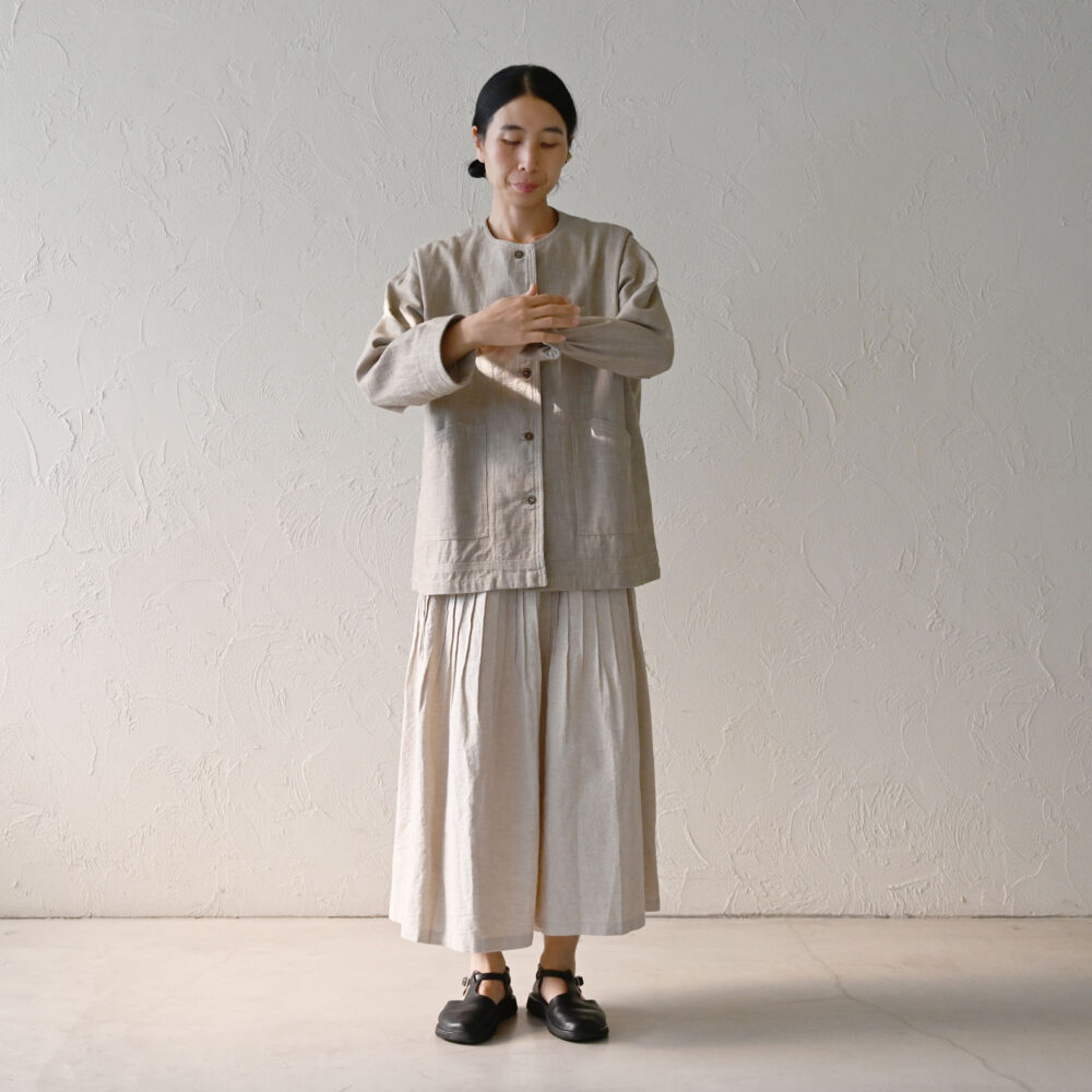 ボトムスにも同じスラブツイル生地を合わせて、上品な大人のスタイリングに。