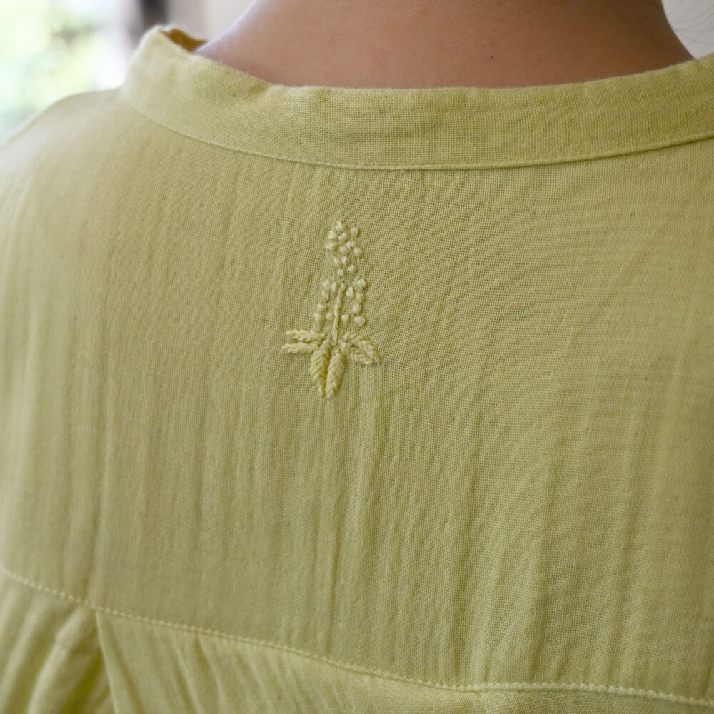 そんな言い伝えから、右胸のポケットの中に、ニームの葉をこっそりと手刺繍でしのばせませています。
