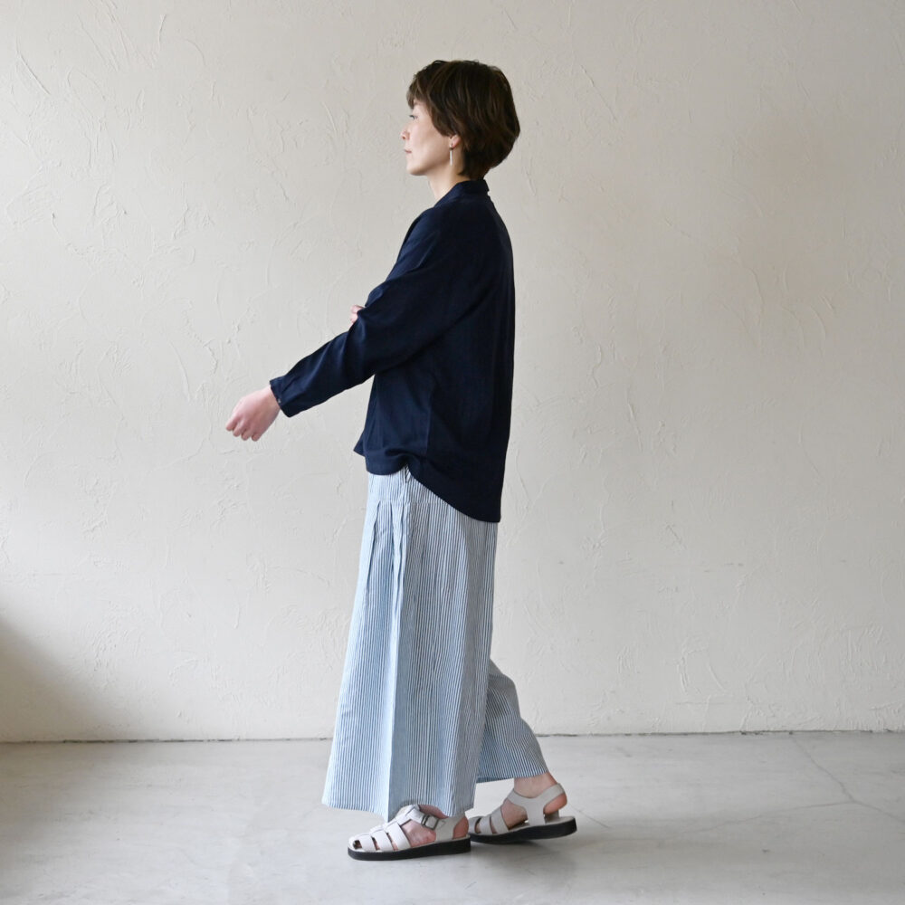 今回はさわやかなストライプパンツと合わせてみました。