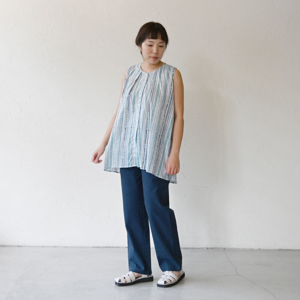 ストレートパンツを足しても重たく、暑い印象にならず、爽やかさもプラスされます。