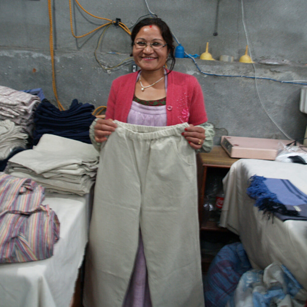 ネパール・マハグチの工房では毎シーズン、パンツづくりの音が快活に響き渡ります。