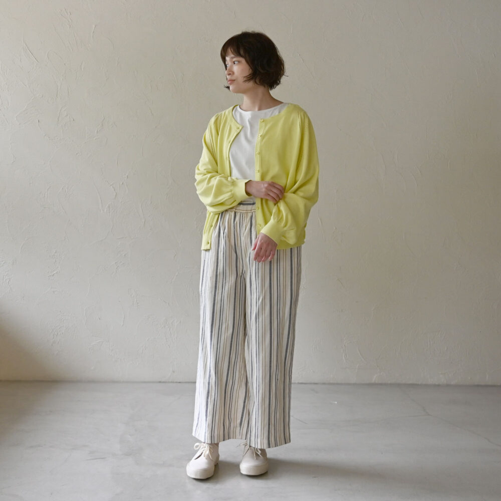 白をベースとした着こなしに、フレッシュさを感じさせるイエローのカーディガンを。