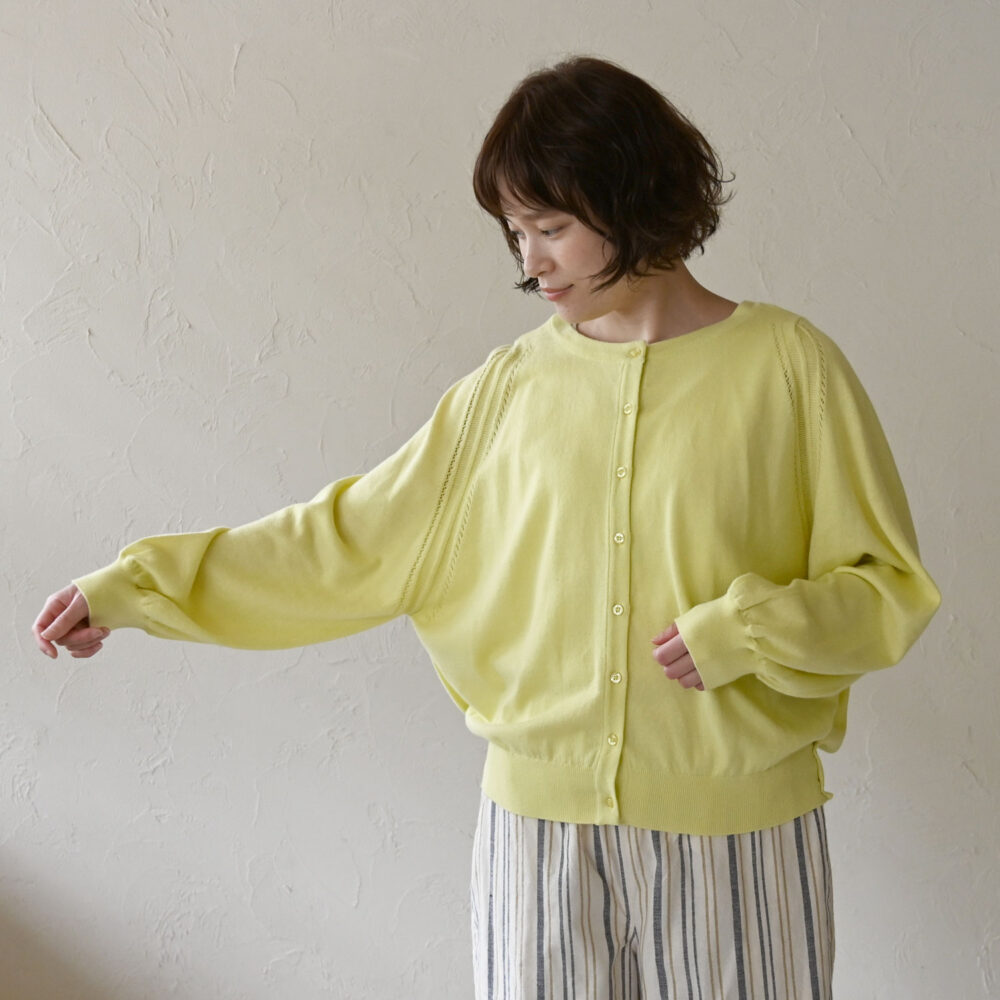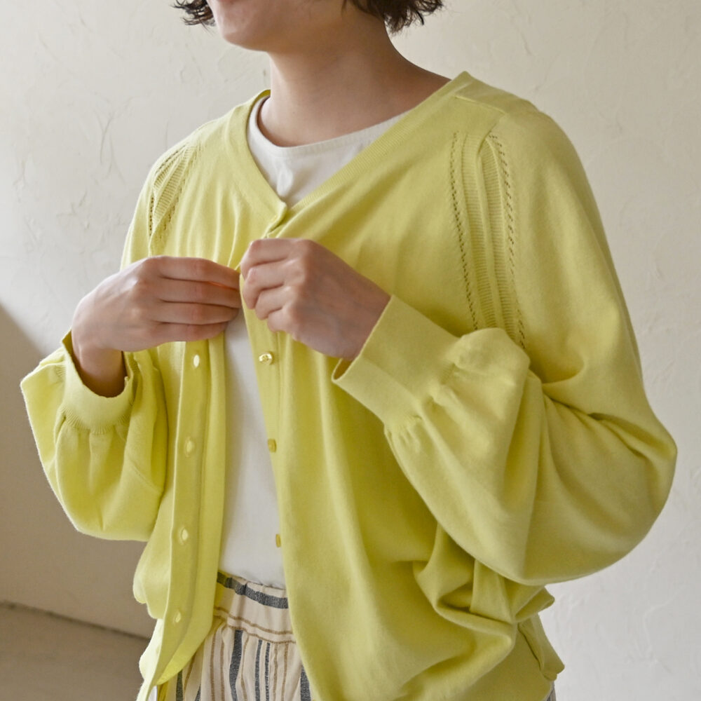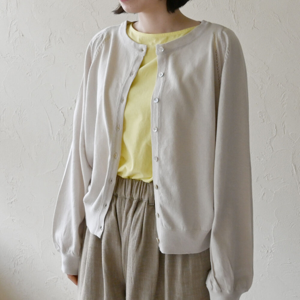ボタンはキレイめカーディガンと相性のいいシェルボタンを使用しました。