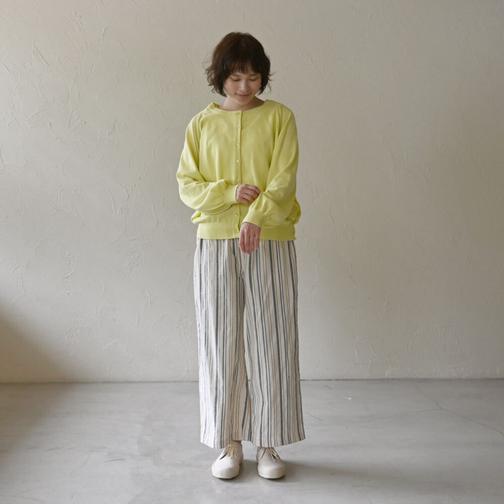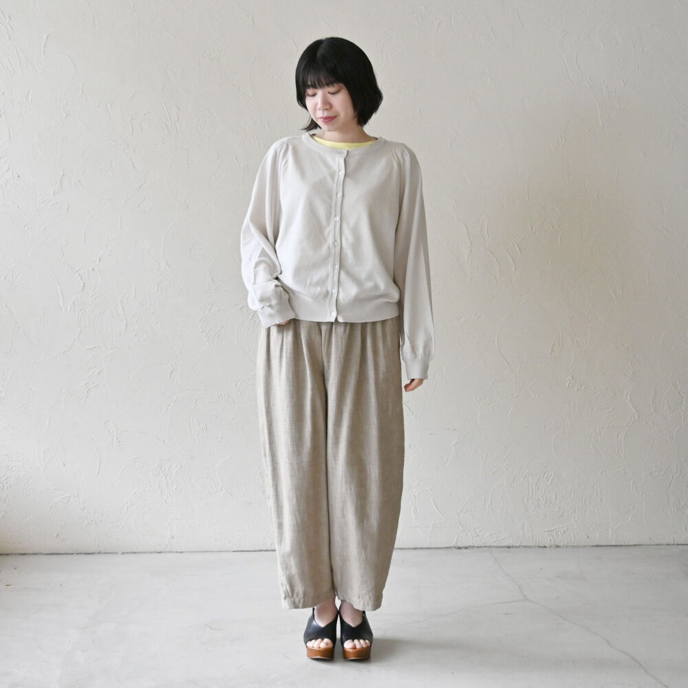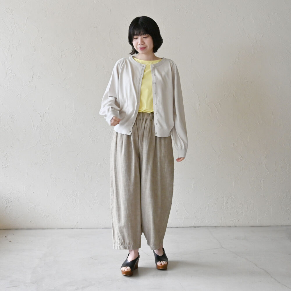 ラウンドネックのカーディガンは少しキレイめな印象。