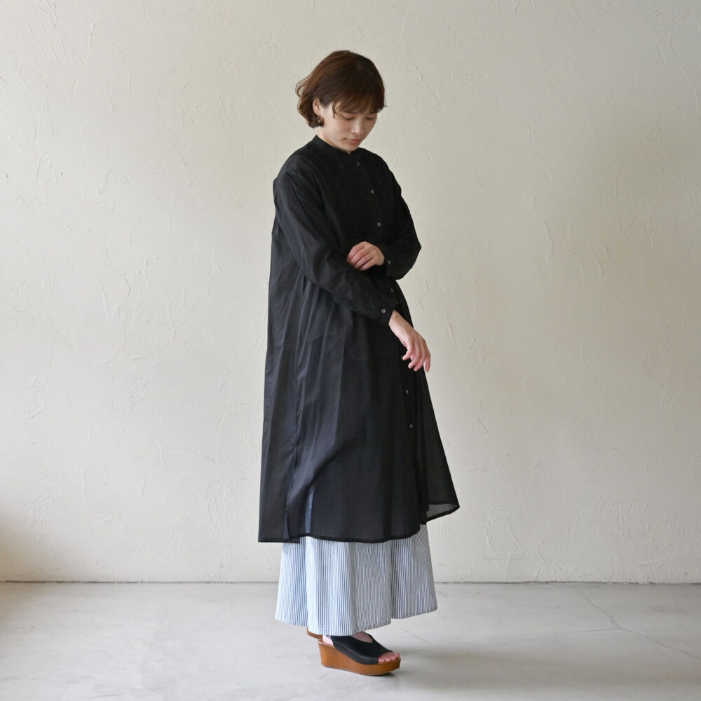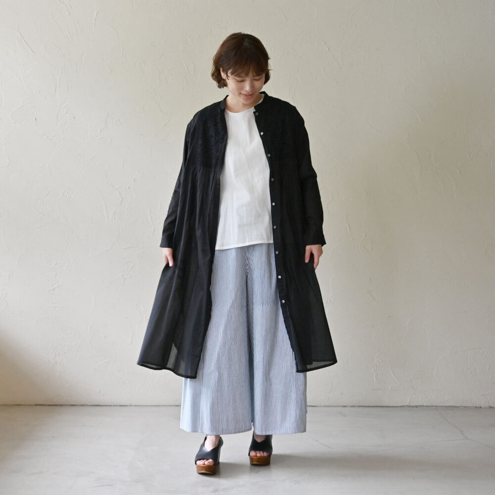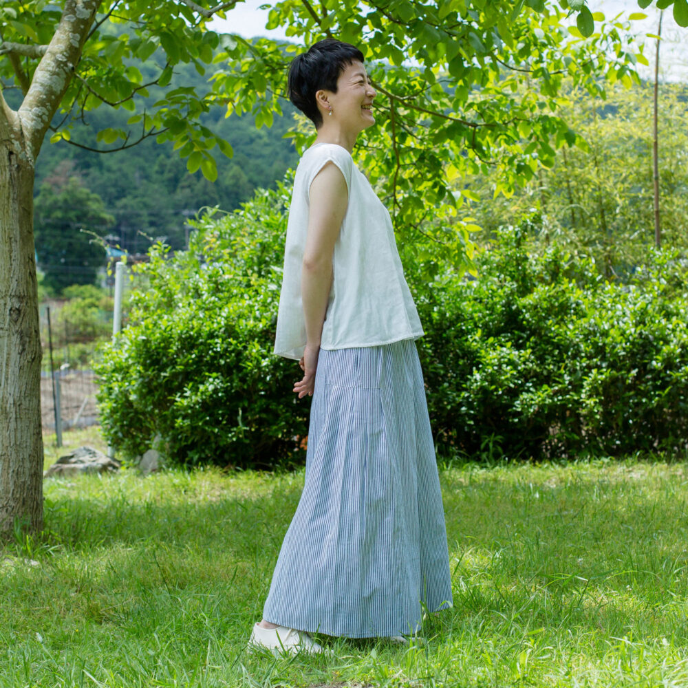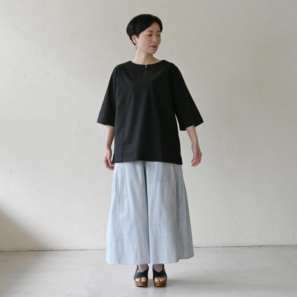 少し太めの糸を使用した平織コットン生地は、ハリがあるので体にまとわりつかず、真夏にもおすすめ。
