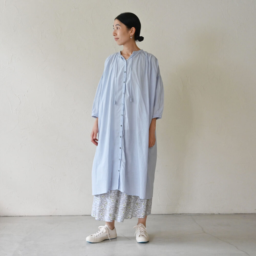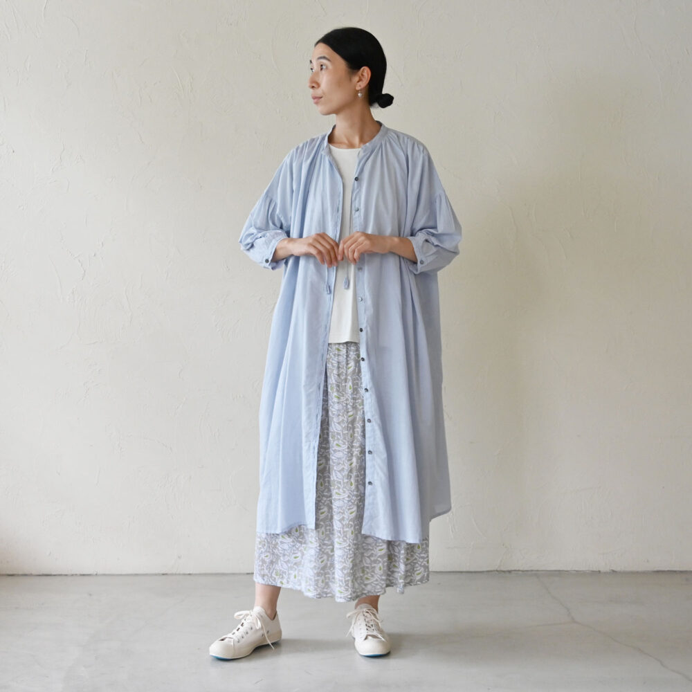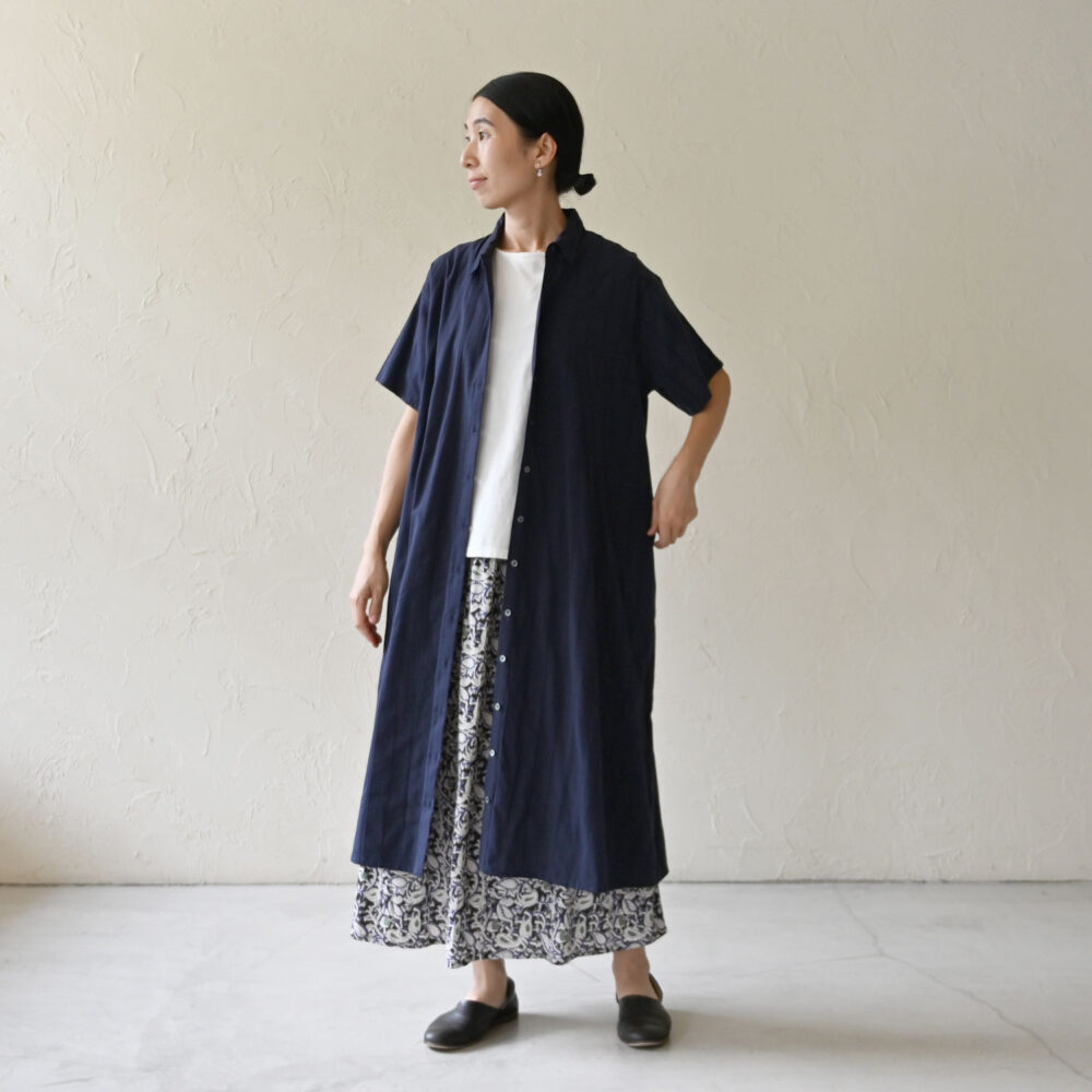 ニュアンスあるスラブ生地のワンピースを取り入れて、さらっと羽織ったりスカートをチラ見せしたり。