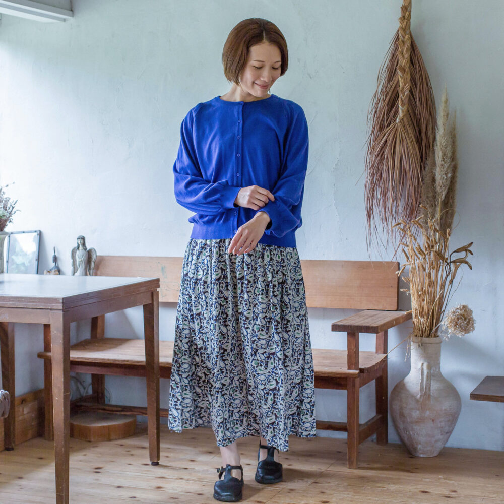鮮やかなブルーのカーディガンと合わせた、上品で大人なスタイリング。