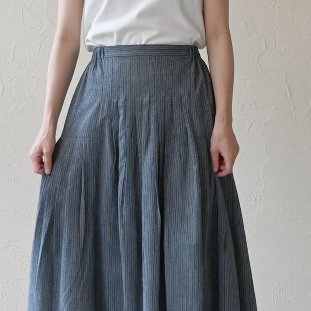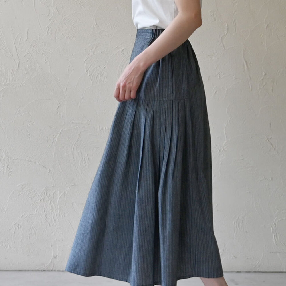 デニムと合わせる感覚で、暑い日はタックスカートと白Tシャツ。
