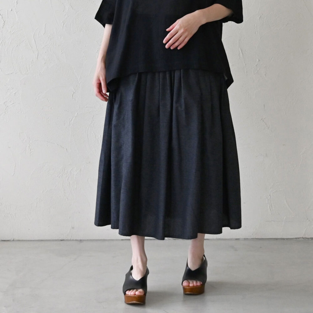 タックを後ろにして穿くことで前面から見るとゴム仕様のギャザースカートに。