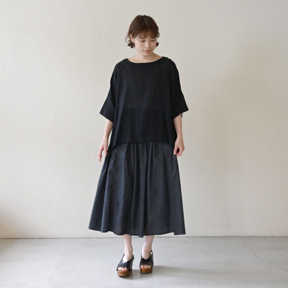 切り替えとタックがポケット下にあることで、ゆるやかなAラインシルエットに。