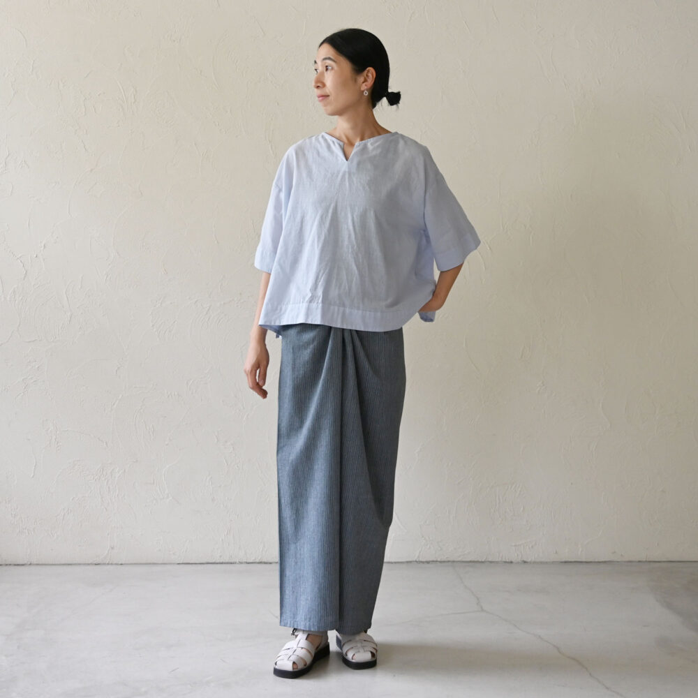 クロスパンツならではのギャザーとマーメイドラインがキレイに出る穿き方です。