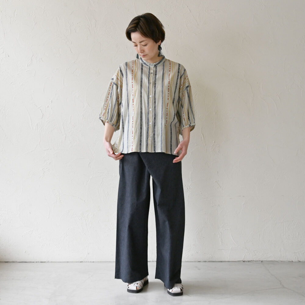 細かいピッチのランダムなストライプはアジアの風を感じるニュアンスある生地です。