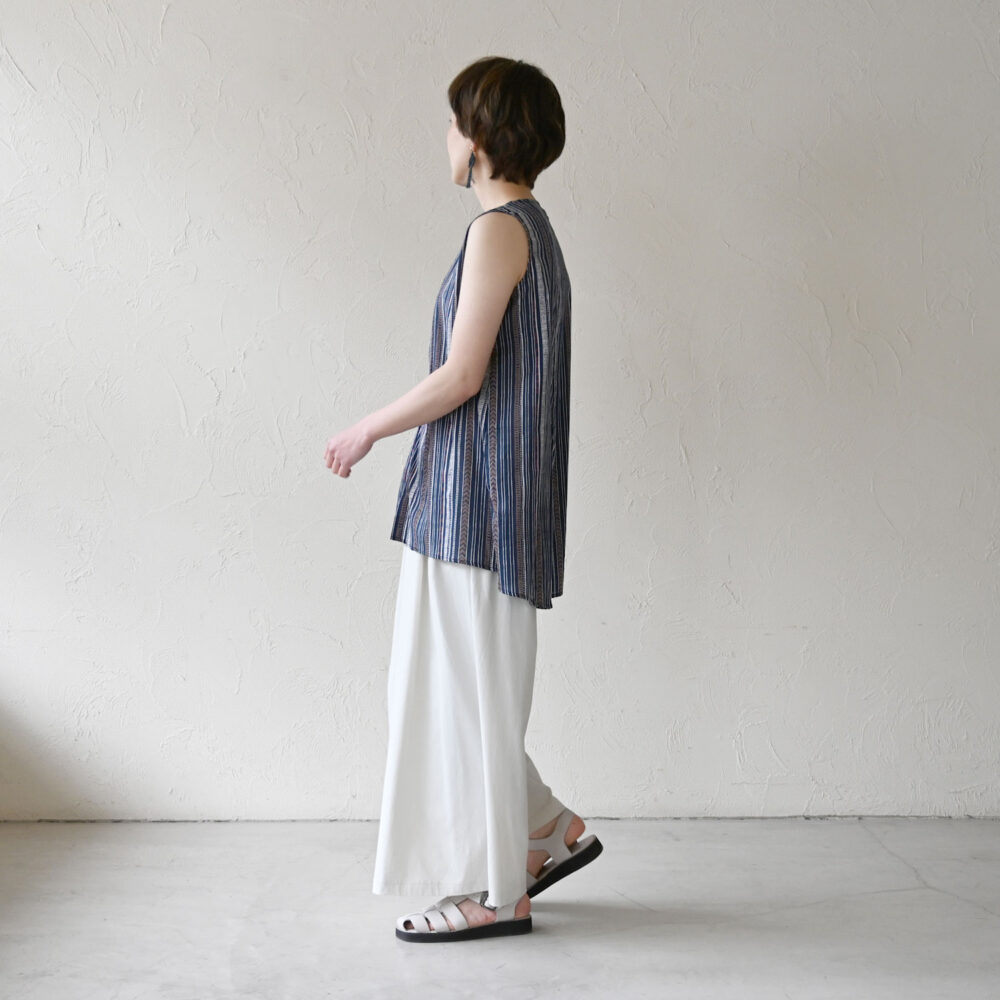トップスとサンダルを白で合わせて、シンプルな着こなしに。