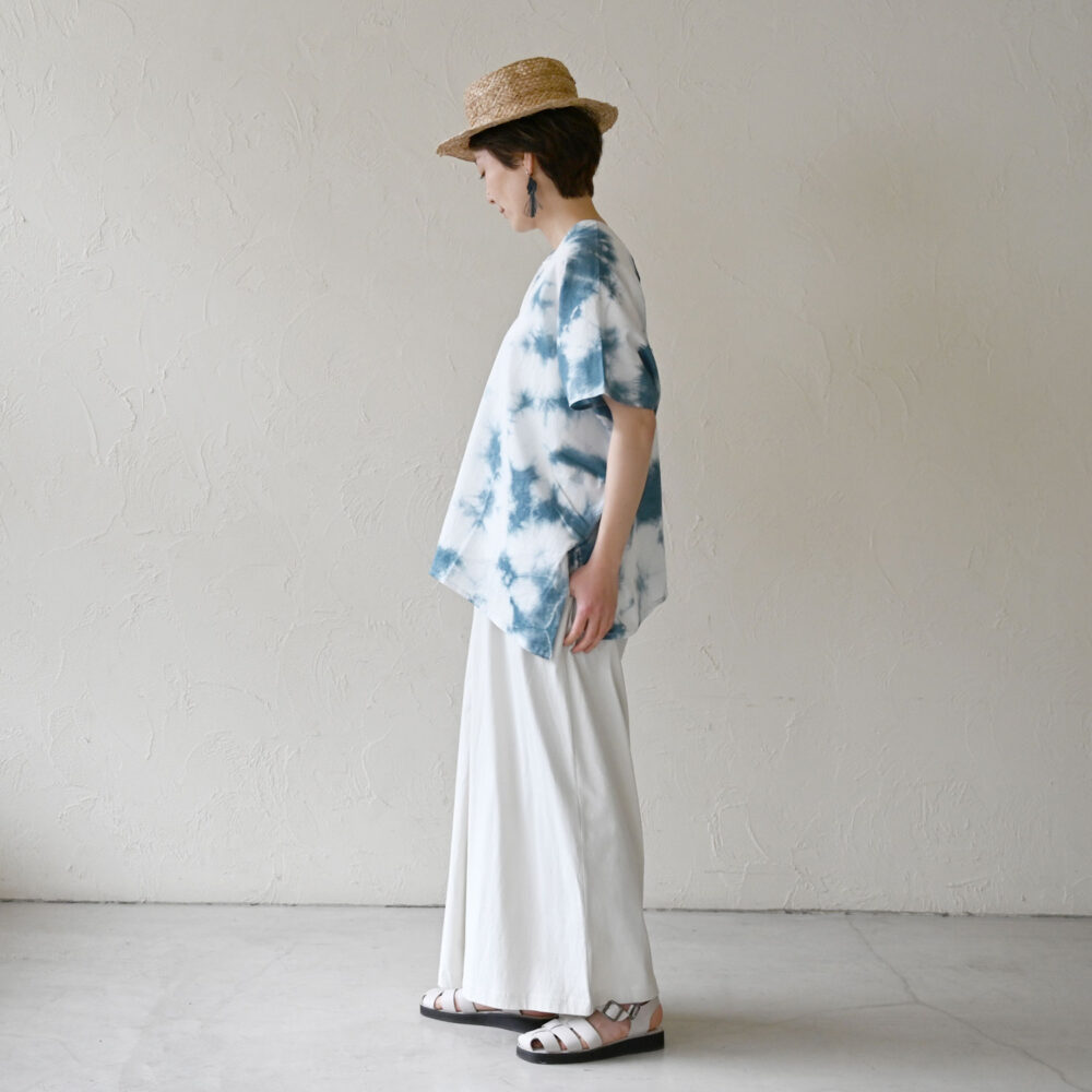 白をベースとした着こなしに、タイダイ染めのまだらな色合いが渋くかっこいい印象に。