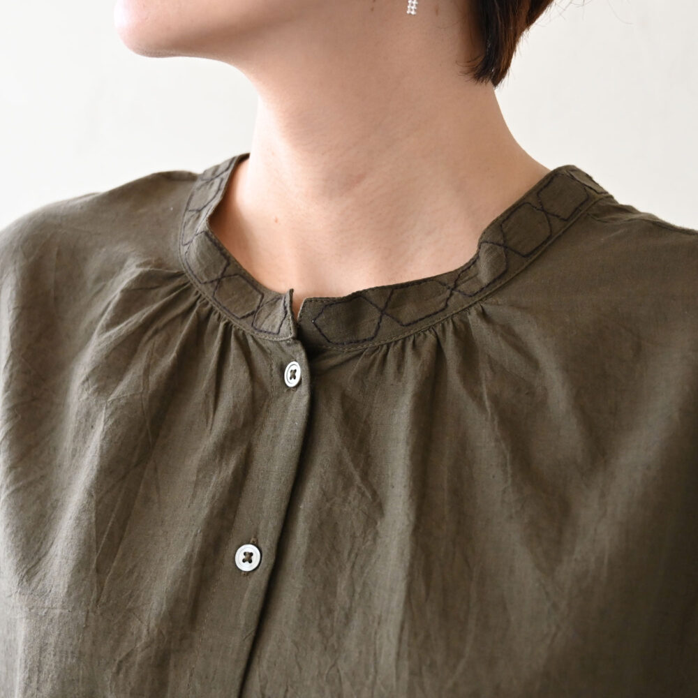 デザインポイントのひとつは、スタンドカラーにさり気ない配色で描かれた幾何学模様のステッチ!