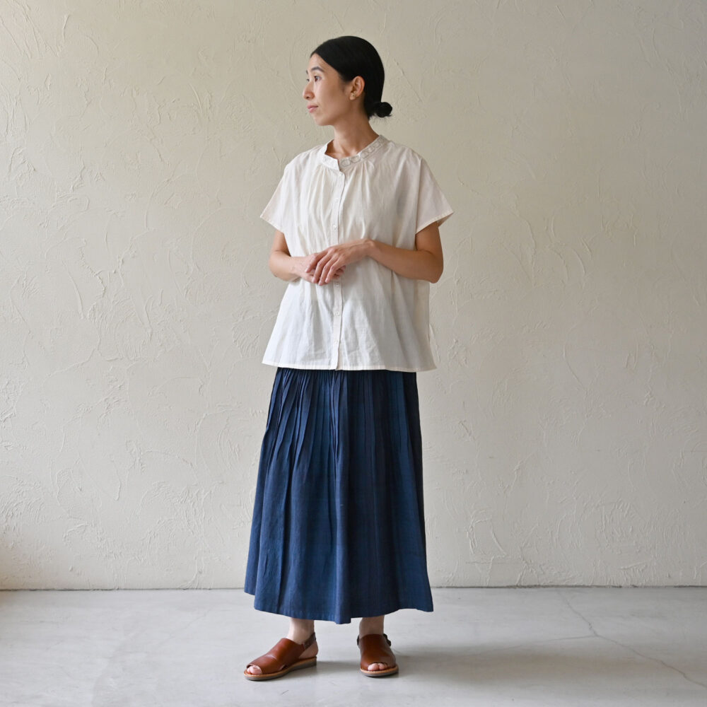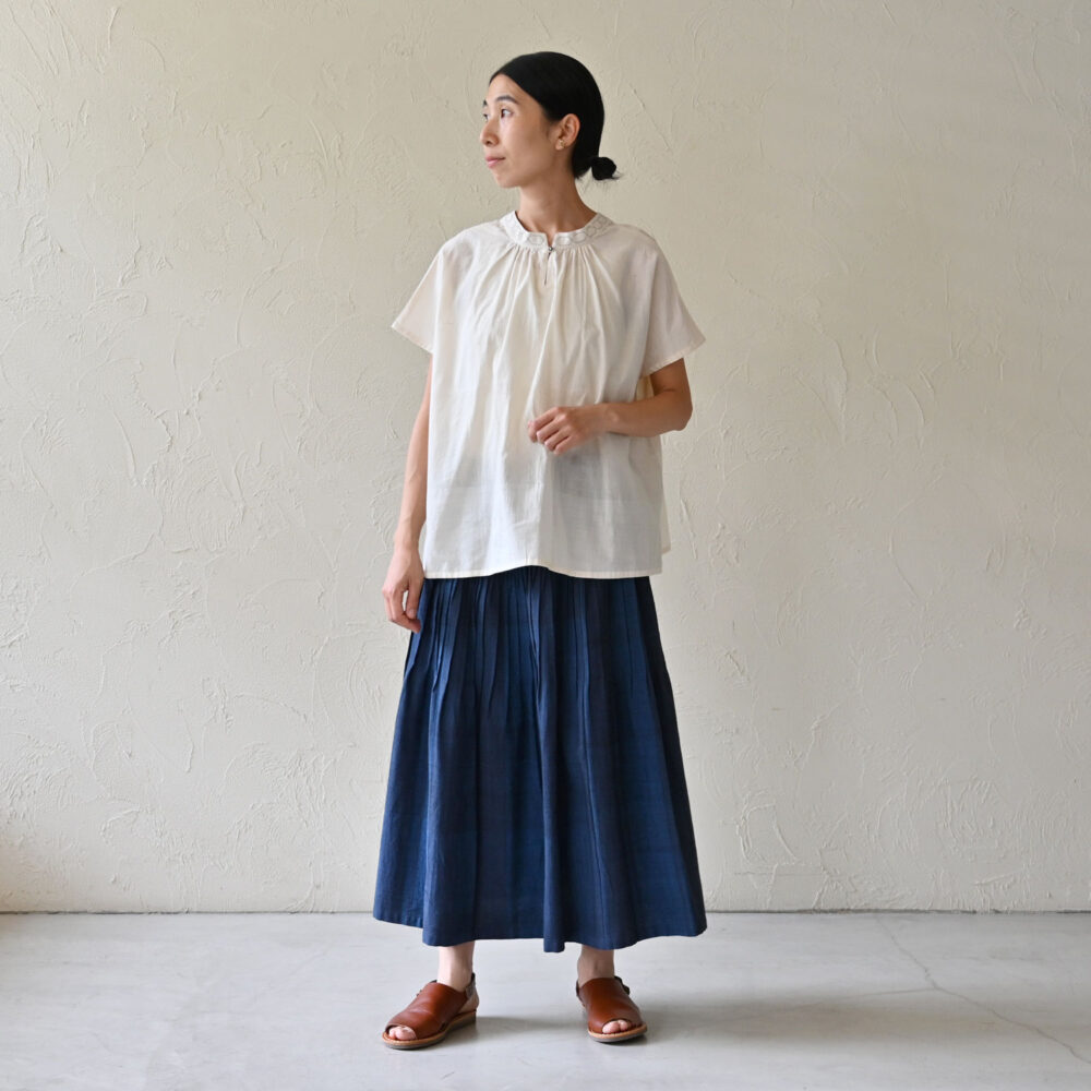 美しい藍染めのピンタックスカートと合わせた特別なスタイリング。